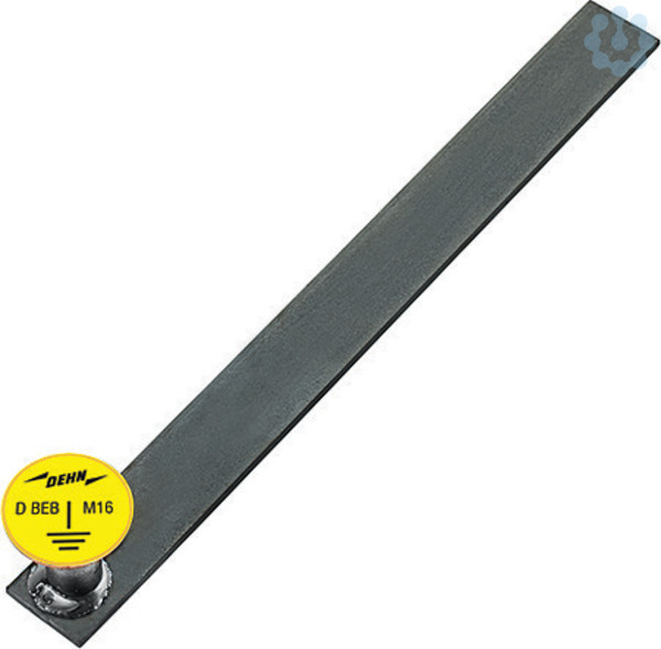 Flachstahl-Erdungsbrücke nach Richtline der DB Netz AG Ril 997.0205A01, zur Erdung, Rückstromführung sowie dem Potentialausgleich im Nutzungsbereich von Bahnstrecken. Bestehend aus Anschlussplatte aus NIRO mit Anschlussgewinde M16 und Flachstahl. Ausgelegt für Kurzschlussströme > 25 kA.