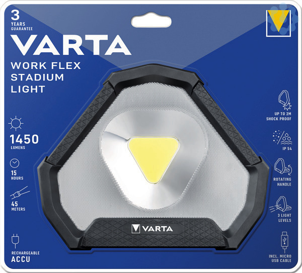 Wiederaufladbare Arbeitsleuchte mit einem Li-Ionen Akku und der COB LED Technologie. Extra helle Flächenleuchte mit bis zu 1450 Lumen (3 Lichtmodi), 15h Laufzeit und 45m Leuchtweite. Integrierter USB-In Anschluss, der mit allen Micro-USB Kabeln funktioniert. Sie hat eine Ladeanzeige, ein optisches Signal bei leeren Batterien, ist stoßfest (2m) und spritzwasser- und staubgeschützt (IP54). Sie verfügt über eine schmutzresistente Oberfläche und hat ein verstellbares Flächenlicht. Der verstellbare Standfuß (7 Positionen) ermöglicht das Hängen oder Stellen der Leuchte. Im Griffstück ist ein integrierter Haken. Garantierte und bewährte VARTA Qualität.