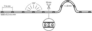 im Silikonschlauch mit selbstklebender Rückseite, für die Innen- und Außenanwendung, IP66 UV-beständig alle 50 mm / 7 LEDs teilbar Anzahl der LEDs: 700 LED-Abstand: 7,14 mm Ausstrahlwinkel: 120° CRI: >90 Lichtstrom pro Meter: 761 lm Betriebsspannung: 24V DC Leistung pro Meter: 9,6 W Lebensdauer L70B50: >= 36.000 h Energieeffiziensklasse: G LxBxH in mm: 5.000 x 9,2 x 4,4 Maximale Länge pro Anschluss: 5 Meter. Für größere Längen neu einspeisen. Lieferumfang: 5 Meter-Rolle mit 300 mm Anschlussleitung, 10 x Befestigungshalter, 10 x Schraube