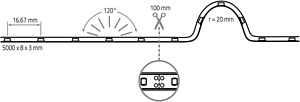 flexibler LED Strip mit Polyurethan überzogen und selbstklebender Rückseite, für die Innen- und Außenanwendung, IP67 alle 100 mm / 6 LEDs teilbar Anzahl der LEDs: 300 LED Abstand: 16,67 mm Ausstrahlwinkel: 120° CRI: > 80 Lichtstrom pro Meter: 386 lm Leistung pro Meter: 4,8 W Energieeffizienzklasse: G Lebensdauer L70B50: >= 72.000 h LxBxH in mm: 5.000 x 8 x 3 Maximale Länge pro Anschluss: 10 Meter. Für größere Längen neu einspeisen.