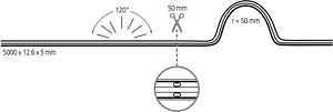 mit selbstklebender Rückseite, für die Innen- und Außenanwendung, IP67 Speziell für den Saunabereich UV-beständig alle 50 mm / 24 LEDs teilbar Anzahl der LEDs: 2400 LED Abstand: 2,08 mm Ausstrahlwinkel: 120° CRI: >90 Lichtstrom pro Meter: 891 lm Betriebsspannung: 24V DC Leistung pro Meter: 10 W Lebensdauer L70B50: >= 60.000 h Energieeffizienzklasse: F LxBxH in mm: 5.000 x 12,6 x 5 Temperaturbereich ohne Profil: -20 bis +80° C Temperaturbereich mit PC-Profil: -20 bis +100° C Maximale Länge pro Anschluss: 5 Meter. Für größere Längen neu einspeisen. Lieferumfang: 5 Meter-Rolle mit 180 mm Anschlussleitung