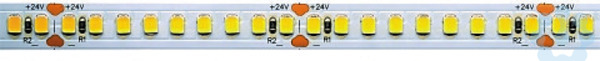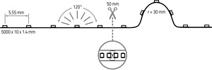 mit selbstklebender Rückseite, für die Innenanwendung, IP20 alle 50 mm / 9 LEDs teilbar Anzahl der LEDs: 900 LED Abstand: 5,55 mm Ausstrahlwinkel: 120° CRI: >80 Lichtstrom pro Meter: 1467 lm Betriebsspannung: 24V DC Leistung pro Meter: 8,8 W Lebensdauer L70B50: >= 50.000 h Energieeffizienzklasse: C LxBxH in mm: 5.000 x 10 x 1,4 Maximale Länge pro Anschluss: 5 Meter. Für größere Längen neu einspeisen. Lieferumfang: 5 Meter-Rolle mit 300 mm Anschlussleitung