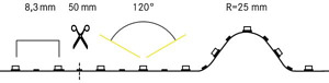 LED-Flexplatine Thin4, 50 mm, CRI > 90, 7,2 W / m, IP00, LED-Weißlicht, CRI > 90 LED-Flexplatine zur Länge: 50.0 mm Lampenleistung je Meter: 7.2 W/m, Lichtstrom je Meter: 560.0 lm/m, Schutzart raumseitig: IP00, Schutzklasse: III, Spannung: 24V DC, Abstrahlwinkel: 120.0 °, 120 LEDs pro Meter, Chip-Abstand (Short Pitch) : 8,3mm. Zur Individuellen Anwendung kann die LED-Flexplatine alle 50 mm eingekürzt werden. Die maximale Systemlänge von 5.000mm darf mit einer Einspeisung nicht überschritten werden.