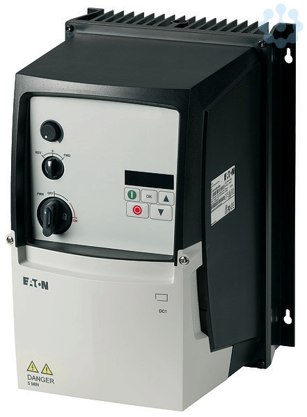 Frequenzumrichter, Typkenner: DC1, Bemessungsbetriebsspannung: Ue = 230 V AC, 1-phasig, 240 V AC, 1-phasig, Ausgangsspannung bei Ue: U2 = 230 V AC, 3-phasig, 240 V AC, 3-phasig, Netzspannung (50/60Hz): ULN = 200 (-10%) - 240 (+10%) V, Bemessungsbetriebsstrom bei 150 % Überlast: Ie = 15.3 A, Hinweis: Bemessungsbetriebsstrom bei einer Schaltfrequenz von 8 kHz und einer Umgebungstemperatur von +40 °C, Hinweis: Überlastzyklus für 60 s alle 600 s, Zugeordnete Motorleistung Hinweis: für normale vierpolige, innen- und außenbelüftete Drehstrom-Asynchronmotoren mit 1500 min-1 bei 50 Hz bzw. 1800 min-1 bei 60 Hz, Überlastzyklus für 60 s alle 600 s, bei 230 V, 50 Hz, Zugeordnete Motorleistung 150 % Überlast: P = 4 kW, 150 % Überlast: IM = 14.8 A, Zugeordnete Motorleistung Hinweis: bei 220 - 240 V, 60 Hz, Zugeordnete Motorleistung 150 % Überlast: P = 5 HP, Zugeordnete Motorleistung 150 % Überlast: IM = 15.2 A, Schutzart: IP66/NEMA 4X, Schnittstelle/Feldbus (eingebaut): OP-Bus (RS485)/Modbus RTU, CANopen®, Feldbusanschaltung (optional): SmartWire-DT, Ausstattung: Brems-Chopper, 7-Segment-Anzeige, Lokale Bedienelemente, Baugröße: FS3, Normen und Bestimmungen: Allgemeine Anforderungen: IEC/EN 61800-2, EMV-Anforderungen: IEC/EN 61800-3, Anforderungen an die Sicherheit: IEC/EN 61800-5-1