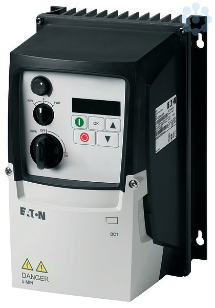 Frequenzumrichter, Typkenner: DC1, Bemessungsbetriebsspannung: Ue = 230 V AC, 1-phasig, 240 V AC, 1-phasig, Ausgangsspannung bei Ue: U2 = 230 V AC, 3-phasig, 240 V AC, 3-phasig, Netzspannung (50/60Hz): ULN = 200 (-10%) - 240 (+10%) V, Bemessungsbetriebsstrom bei 150 % Überlast: Ie = 2.3 A, Hinweis: Bemessungsbetriebsstrom bei einer Schaltfrequenz von 16 kHz und einer Umgebungstemperatur von +40 °C, Hinweis: Überlastzyklus für 60 s alle 600 s, Zugeordnete Motorleistung Hinweis: für normale vierpolige, innen- und außenbelüftete Drehstrom-Asynchronmotoren mit 1500 min-1 bei 50 Hz bzw. 1800 min-1 bei 60 Hz, Überlastzyklus für 60 s alle 600 s, bei 230 V, 50 Hz, Zugeordnete Motorleistung 150 % Überlast: P = 0.37 kW, 150 % Überlast: IM = 2 A, Zugeordnete Motorleistung Hinweis: bei 220 - 240 V, 60 Hz, Zugeordnete Motorleistung 150 % Überlast: P = 0.5 HP, Zugeordnete Motorleistung 150 % Überlast: IM = 2.2 A, Schutzart: IP66/NEMA 4X, Schnittstelle/Feldbus (eingebaut): OP-Bus (RS485)/Modbus RTU, CANopen®, Feldbusanschaltung (optional): SmartWire-DT, Ausstattung: 7-Segment-Anzeige, Lokale Bedienelemente, Baugröße: FS1, Normen und Bestimmungen: Allgemeine Anforderungen: IEC/EN 61800-2, EMV-Anforderungen: IEC/EN 61800-3, Anforderungen an die Sicherheit: IEC/EN 61800-5-1