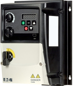 Frequenzumrichter, Typkenner: DC1, Bemessungsbetriebsspannung: Ue = 230 V AC, 3-phasig, 240 V AC, 3-phasig, Ausgangsspannung bei Ue: U2 = 230 V AC, 3-phasig, 240 V AC, 3-phasig, Netzspannung (50/60Hz): ULN = 200 (-10%) - 240 (+10%) V, Bemessungsbetriebsstrom bei 150 % Überlast: Ie = 4.3 A, Hinweis: Bemessungsbetriebsstrom bei einer Schaltfrequenz von 6 kHz und einer Umgebungstemperatur von +40 °C, Hinweis: Überlastzyklus für 60 s alle 600 s, Zugeordnete Motorleistung Hinweis: für normale vierpolige, innen- und außenbelüftete Drehstrom-Asynchronmotoren mit 1500 min-1 bei 50 Hz bzw. 1800 min-1 bei 60 Hz, Überlastzyklus für 60 s alle 600 s, bei 230 V, 50 Hz, Zugeordnete Motorleistung 150 % Überlast: P = 0.75 kW, 150 % Überlast: IM = 3.2 A, Zugeordnete Motorleistung Hinweis: bei 220 - 240 V, 60 Hz, Zugeordnete Motorleistung 150 % Überlast: P = 1 HP, Zugeordnete Motorleistung 150 % Überlast: IM = 4.2 A, Schutzart: IP66/NEMA 4X, Schnittstelle/Feldbus (eingebaut): OP-Bus (RS485)/Modbus RTU, CANopen®, Feldbusanschaltung (optional): SmartWire-DT, Ausstattung: Funkentstörfilter, 7-Segment-Anzeige, Lokale Bedienelemente, zusätzlicher Platinenschutz, UV-beständig, Baugröße: FS1, Normen und Bestimmungen: Allgemeine Anforderungen: IEC/EN 61800-2, EMV-Anforderungen: IEC/EN 61800-3, Anforderungen an die Sicherheit: IEC/EN 61800-5-1