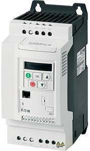 Frequenzumrichter, Typkenner: DC1, Bemessungsbetriebsspannung: Ue = 400 V AC, 3-phasig, 480 V AC, 3-phasig, Ausgangsspannung bei Ue: U2 = 400 V AC, 3-phasig, 480 V AC, 3-phasig, Netzspannung (50/60Hz): ULN = 380 (-10%) - 480 (+10%) V, Bemessungsbetriebsstrom bei 150 % Überlast: Ie = 5.8 A, Hinweis: Bemessungsbetriebsstrom bei einer Schaltfrequenz von 16 kHz und einer Umgebungstemperatur von +50 °C, Hinweis: Überlastzyklus für 60 s alle 600 s, Zugeordnete Motorleistung Hinweis: für normale vierpolige, innen- und außenbelüftete Drehstrom-Asynchronmotoren mit 1500 min-1 bei 50 Hz bzw. 1800 min-1 bei 60 Hz, Überlastzyklus für 60 s alle 600 s, bei 400 V, 50 Hz, Zugeordnete Motorleistung 150 % Überlast: P = 2.2 kW, 150 % Überlast: IM = 5 A, Zugeordnete Motorleistung Hinweis: bei 440 - 480 V, 60 Hz, Zugeordnete Motorleistung 150 % Überlast: P = 3 HP, Zugeordnete Motorleistung 150 % Überlast: IM = 4.8 A, Schutzart: IP20/NEMA 0, Schnittstelle/Feldbus (eingebaut): OP-Bus (RS485)/Modbus RTU, CANopen®, Feldbusanschaltung (optional): SmartWire-DT, Ausstattung: Funkentstörfilter, Brems-Chopper, 7-Segment-Anzeige, Baugröße: FS2, Normen und Bestimmungen: Allgemeine Anforderungen: IEC/EN 61800-2, EMV-Anforderungen: IEC/EN 61800-3, Anforderungen an die Sicherheit: IEC/EN 61800-5-1