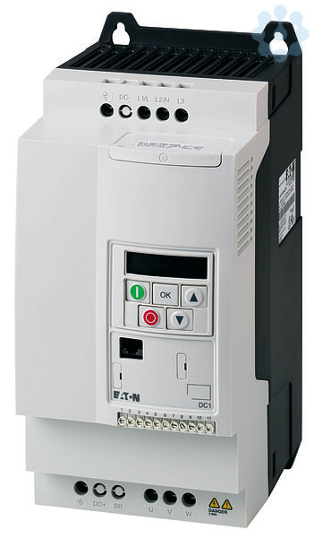 Frequenzumrichter, Typkenner: DC1, Bemessungsbetriebsspannung: Ue = 400 V AC, 3-phasig, 480 V AC, 3-phasig, Ausgangsspannung bei Ue: U2 = 400 V AC, 3-phasig, 480 V AC, 3-phasig, Netzspannung (50/60Hz): ULN = 380 (-10%) - 480 (+10%) V, Bemessungsbetriebsstrom bei 150 % Überlast: Ie = 18 A, Hinweis: Bemessungsbetriebsstrom bei einer Schaltfrequenz von 16 kHz und einer Umgebungstemperatur von +50 °C, Hinweis: Überlastzyklus für 60 s alle 600 s, Zugeordnete Motorleistung Hinweis: für normale vierpolige, innen- und außenbelüftete Drehstrom-Asynchronmotoren mit 1500 min-1 bei 50 Hz bzw. 1800 min-1 bei 60 Hz, Überlastzyklus für 60 s alle 600 s, bei 400 V, 50 Hz, Zugeordnete Motorleistung 150 % Überlast: P = 7.5 kW, 150 % Überlast: IM = 15.2 A, Zugeordnete Motorleistung Hinweis: bei 440 - 480 V, 60 Hz, Zugeordnete Motorleistung 150 % Überlast: P = 10 HP, Zugeordnete Motorleistung 150 % Überlast: IM = 14 A, Schutzart: IP20/NEMA 0, Schnittstelle/Feldbus (eingebaut): OP-Bus (RS485)/Modbus RTU, CANopen®, Feldbusanschaltung (optional): SmartWire-DT, Ausstattung: Funkentstörfilter, Brems-Chopper, 7-Segment-Anzeige, Baugröße: FS3, Anbindung an SmartWire-DT: mit SmartWire-DT Modul DX-NET-SWD3, Normen und Bestimmungen: Allgemeine Anforderungen: IEC/EN 61800-2, EMV-Anforderungen: IEC/EN 61800-3, Anforderungen an die Sicherheit: IEC/EN 61800-5-1