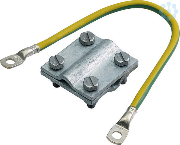 Bestehend aus einem Fundamenterder/Kreuzverbinder (60x60 mm) für Rundstahl (8-10 mm) oder Flachstahl (30 mm) montiert mit 300 mm PE- Leitung 16mm² und angecrimptem Rohrkabelschuh M8 zum Anschluss an den Erdungsbolzen der Ladestation