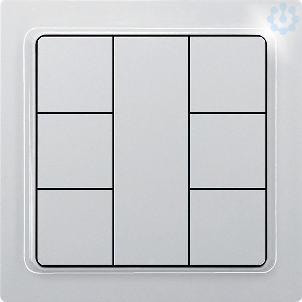 Funk-6-Kanal-Taster im E-Design55, 80x80mm außen, Rahmen-Innenmaß 55x55mm, 15mm hoch. Sehr leise und mit Batterie (Lebensdauer 5-8 Jahre). Der Funk-6-Kanal-Taster kann 6 auswertbare Taster-Telegramme senden. Er besteht gewissermaßen aus einem oberen 4-Kanal-Taster und einem unteren 2-Kanal-Taster. Die Halteplatte kann auf eine ebene Fläche geschraubt oder mit der beiliegenden Klebefolie an die Wand, auf Glas oder auf Möbel geklebt werden. Über einer 55mm-Schalterdose werden die in der Dose vorhandenen Hülsen zur Schraubbefestigung verwendet.