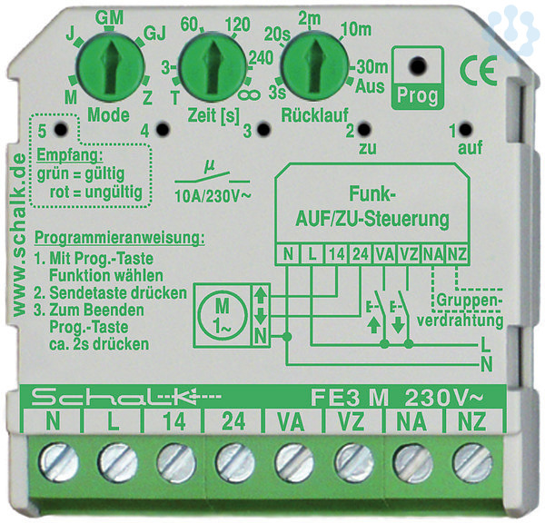 Zusammen mit den Sendern der FS3-Serie ist der Funkempfänger FE3 M eine universell einsetzbare (Funk-)Motorsteuerung, z.B. für Rollläden und Jalousien, Klappläden, Dachfenster, Rauchabzugshauben in Brandschutzanlagen, Torantriebe, Ventilsteuerungen usw. Es ist sowohl eine Ein- als auch eine Zweitaster-Motorsteuerung realisierbar. Durch die vorrangigen Nebenstelleneingänge ist es möglich, mehrere FE3 M zu Gruppen- und Zentralsteuerungen zusammenzufassen. Die Motorlaufzeit kann zeitlich begrenzt werden um z.B. bei mechanischer Blockade den Motor nicht zu überlasten. Eine komfortable, automatische und einstellbare Schließfunktion verhindert u.a. ein unbeabsichtigtes Offenlassen eines Dachfensters. Durch eine spezielle Jalousie-Betriebsart können die Lamellenwinkel exakt verstellt, oder nach dem Abschalten automatisch auf einen bestimmten Winkel rückgestellt werden. Durch die sehr kompakten Abmessungen von 43 x 43 x 18.5mm ist eine problemlose Installation in gängige Unterputz-Installationsdosen möglich.,Kompatible Produkte: Funksender FS3-Serie, Repeater FV2 R.,Lieferbar in den Varianten 230V AC (für Wechselstrommotoren) oder 12-24V DC (für Gleichstrommotoren), Maße: 43x43x18.5mm, 230V AC