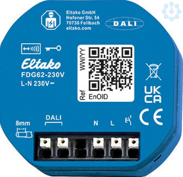 Funk-DALI-Gateway, bidirektional für die UP-Dose. Stand-by-Verlust nur 0,5 Watt. Für Einbaumontage. 49x51mm, 20mm tief. Die Anschlussklemmen sind Steckklemmen für Leiterquerschnitte von 0,2mm² bis 2,5mm². Mit der komfortablen Tipp-Technik können bis zu 32 Funk-Universaltaster, Funk-Richtungstaster, Funk-Zentralsteuertaster, Bewegungssensoren, Weißton- und Intensitäts-Doppelwippentaster eingelernt werden. Bidirektionaler Funk aktivierbar. Versorgungsspannung 230V an den Klemmen N und L. An den DALI-Klemmen werden das DALI-Bus-Netzteil DL-N2-80mA und bis zu 40 Stück DALI-Geräte angeschlossen. Mit dem Gateway FDG62 werden DALI-Geräte mit EnOcean-Funksendern angesteuert. Es kann nur der Broadcastbefehl abgesetzt werden. Zusätzlich zum Funk-Steuereingang über eine innenliegende Antenne, können die angeschlossenen DALI-Geräte auch mit einem eventuell davor montierten 230V-Steuertaster angesteuert werden. Ein Glimmlampenstrom ist nicht zugelassen. Das FGD62 speichert intern den Dimmwert und stellt diesen Wert als Rückmeldung bereit. Somit können mit den Rückmeldungen Aktoren angesteuert werden. Es werden dabei dieselben Rückmeldetelegramme erzeugt, wie bei einem FD62NPN. Das FDG62 erfüllt die Funktionen des DALI-Masters.