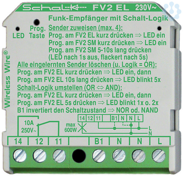 Funkverbinder-Empfänger für das FV2 System mit potentialfreiem 10A Wechslerkontakt. In Verbindung mit dem Batteriebetriebenen Funkverbinder-Sender FV2 SM lässt sich somit z.B. eine für geschlossene Räume häufig vorgeschriebene Zuluftüberwachung beim Betrieb von Abzugsventilatoren ohne die Verlegung von Leitungen realisieren. Beim FV2 EL ermöglichen die zusätzlichen Schaltlogik-Funktionen (OR, NOR, AND, NAND) eine gleichzeitige Auswertung von bis zu vier FV2-Sendern., Maße: 43x43x18,5mm, 230V AC - 1 Wechsler (potentialfrei) 10A