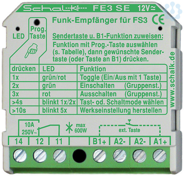 Mit dem Funk-Empfängerschalter FE3 SE (12V) können elektrische Betriebsmittel (Lampen, Tastdimmer, Türöffner usw.) mittels Schalk Funk-Hand- oder UP-Sender drahtlos im Schalt- oder Tastmodus angesteuert werden. Der Funk-Empfängerschalter FE3 SE besitzt einen potentialfreien Umschaltkontakt. Durch seine geringe Bauhöhe von 18,5mm passt er hinter nahezu jeden UP-Schalterdoseneinsatz. Die 3 Funktionen (Toggle, Ein, Aus) können einer beliebigen Sendertaste zugewiesen werden. Die Funktion "Toggle" (abwechselnd Ein-Aus) dient zur Einzelsteuerung. Über die Funktionen "Ein" und "Aus" können auch mehrere Empfänger gemeinsam geschaltet werden (Gruppensteuerung). Die Funktion für den Eingang B1 (bedrahtbarer Vorort-Eingang) ist ebenfalls frei wählbar., Kompatible Produkte: Funksender FS3-Serie, Repeater FV2 R., Maße: 43x43x18,5mm, 12V UC - 1 Wechsler 10A