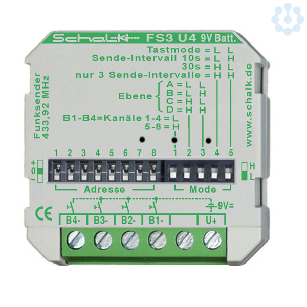 Einbausender zur Ansteuerung durch bis zu 4 externe Taster. Der Sender passt in eine Schalterdosen hinter einen vorhandenen Taster/Schalter, und dients somit der Erweiterung eines bestehenden Schalterprogramm mit Funk-Funktionalität. Durch die Möglichkeit in zeitlich einstellbaren Intervallen zu senden, ist dieses Gerät optimal geeignet, langanhaltende Schaltzustände (wie z.B. Bewegungsmelder, Schaltuhr, Thermostate etc.) verlässig zu übertragen. Für diese Betriebsart kann an den jeweiligen Funkempfängern eine dem Sendeintervall entsprechende Nachlaufzeit eingestellt werden. 3 Betriebsarten (Tastmode, Intervall-Senden mit 10s oder 30s, nur 3 Sendeintervalle). Diese Variante wird mit einem Batterieclip ausgeliefert und kann somit direkt an einer 9V-Blockbatterie betrieben werden., Kompatible Produkte: Funkempfänger FE3-Serie, Funkdimmer FD3-Serie, Repeater FV2 R., Maße: 43x43x33mm, 9V DC, 4 Kanäle