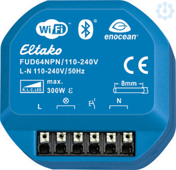 Funk-Universal-Dimmaktor. Mit Power MOSFET. 230V-Glüh- und Halogen-Lampen bis 300W, abhängig von den Lüftungsverhältnissen. Dimmbare 230V-LED-Lampen in der Betriebsart Phasenabschnitt bis 300W, bzw. in der Betriebsart Phasenanschnitt bis 100W, abhängig von den Lüftungsverhältnissen. Mit Kinderzimmer- und Schlummerschaltung. Keine Mindestlast. Stand-by-Verlust nur 0,9 Watt. Für Einbaumontage. 49x51mm, 23mm tief. Die Anschlussklemmen sind Steckklemmen für Leiterquerschnitte von 0,2mm² bis 2,5mm². Mit der komfortablen Tipp-Technik können Funk-Universaltaster, Funk-Richtungstaster und Funk-Zentralsteuertaster eingelernt werden. Der Funk-Universal-Dimmaktor ist in der Werkseinstellung (AUTO) ein Universal-Dimmaktor, welcher je nach angeschlossener Last mit Phasenabschnitt oder Phasenanschnitt dimmt. Bei verschiedenen 230V-LED-Lampen verbessert sich die Dimmfunktion, wenn mit Phasenanschnitt gedimmt wird. Bidirektionaler Funk und Repeater-Funktion aktivierbar. Schaltung im Nulldurchgang mit Soft-Ein und Soft-Aus zur Lampenschonung. Versorgungs-, Schalt- und Steuerspannung örtlich 110-240V. Die eingestellte Helligkeitsstufe bleibt beim Ausschalten gespeichert (Memory). Beim Ausfall der Versorgungsspannung wird definiert ausgeschaltet. Automatische elektronische Überlastsicherung und Übertemperatur-Abschaltung. Zusätzlich zum Funk-Steuereingang über eine innenliegende Antenne kann dieser Funk-Aktor auch mit einem eventuell davor montierten konventionellen Steuertaster örtlich gesteuert werden. Ein Glimmlampenstrom ist nicht zugelassen. Dank eigener IP-Adresse ist auf Wunsch auch der Fernzugriff über das Internet möglich, denn es ist ein IoT-Produkt neuester Generation. Bluetooth ist ebenfalls an Bord. Für den reinen Offlinebetrieb können WiFi, Bluetooth und EnOcean vollkommen deaktiviert werden. Weiterentwickelte Firmware kann über ein Smartphone und das Internet per WiFi eingespielt werden. Per Backup lassen sich alle Einstellungen speichern und bei Bedarf auch in andere Aktoren gleicher Type einspielen. Dieser Aktor ist Apple-zertifiziert und kann daher in Apple HomeKit eingelernt werden. Auch in Google Assistant, Amazon Alexa und andere Systeme kann er nach einem Firmwareupdate eingelernt werden. Mit der Eltako-App lassen sich die Funktionen des Smart Home per Smartphone schnell und einfach einstellen, auslösen und steuern.