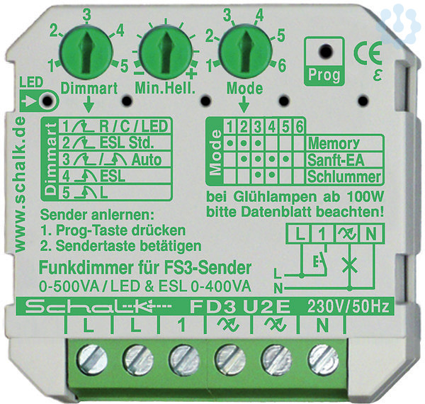 Mit dem elektronischen Funk-Universal-Tastdimmer FD3 U2E im äußerst kompakten Doseneinbaugehäuse lassen sich nahezu alle Leuchtmittel (LED-, Energiespar-, Glühlampen, NV-Halogenlampen mit Tronic- oder gewickelten Trafos, HV-Halogenlampen) dimmen, welche für Phasenan- oder abschnittsteuerung geeignet sind. Die korrekte Dimmart kann automatisch erkannt, oder auch manuell auf Phasenan- oder Phasenabschnitt eingestellt werden. Eine spezielle ESL-Dimmart erzeugt zusätzlich eine Zünd- und Aufwärmphase für Kompaktleuchtstofflampen („Energiesparlampen“). Über den Tastereingang und einen Funksender lässt sich der Dimmer einfach bedienen: kurz tasten = ein- oder ausschalten, lange tasten = auf- oder abdimmen. Eine Funksendertaste kann sehr einfach eingelernt werden. Keine weitere Programmierung notwendig. Die Aktivierung von Helligkeitspeicher, Schlummer- und Sanft-Ein/Aus-Funktion, und die Anpassung der Mindesthelligkeit erfolgen direkt über die Einsteller. Auch als Variante mit speziellen Programmierfunktionen verfügbar (FD3 U2), Kompatible Produkte: Funksender FS3-Serie, Repeater FV2 R., Maße: 43x43x18,5mm, 230V AC
