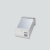 Gehäuse für die Unterputzmontage. Rückseitige Entnahmetür in weiß, nach unten aufgehend, mit Zylinderschloss, Namensschild und Informationsfenster. Geeignet für Mauereinbau (trockenes Mauerwerk) aus feuerverzinktem Stahlblech 0,8 mm, in schräger 45°-Ausführung, ausziehbar von 290 bis 440 mm.