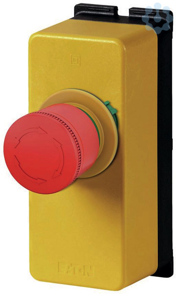 Gehäuse, Sortiment: RMQ-Titan, Komplettgerät, Bauform: Pilzform, Durchmesser: 30 mm, unbeleuchtet, Drehentriegelung, Anschlussart: Cage Clamp, Beschreibung: überlistungssicher nach ISO 13850/EN 418, Cage Clamp ist ein eingetragenes Warenzeichen der Wago Kontakttechnik GmbH, Minden, Rückstellung erfolgt durch Drehen, Befehlsstellen: 1 Anzahl, Farbe Pilzstößel: rot, Farbe Tastensockel: gelb, Farbe Gehäusedeckel: gelb, Farbe RAL-Wert: RAL 3000, Schutzart: IP65, IP66, IP69, Anbindung an SmartWire-DT: nein, Kontaktbestückung Ö = Öffner: 2 Ö, Kontaktbestückung Hinweis = Sicherheitsfunktion, durch Zwangsöffnung nach IEC/EN 60947-5-1, Weg des Bedienteils und Betätigungskraft nach DIN EN 60947-5-1, K.5.4.1 Zwangsöffnungsweg: mm 5.5, maximaler Weg: mm 5.8, Zwangsöffnung (ZW): ja, Normen und Bestimmungen: IEC/EN 60947, VDE 0660, Einbaulage: Nach Bedarf