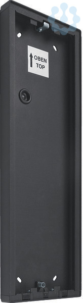 Gehäuse Größe 5 AP für Türstation Edelstahl ONE. Aufputzgehäuse für Türstation aus Aluminium zur Wandmontage. Gehäuse bestehend aus Aluminiumprofil mit Zinkdruckguss-Abschlusselement oben und unten. Profil mit rückseitigen Kabeldurchführung und 4 Langlöchern zur Justierung und Befestigung. Zinkdruckgusselemente mit integriertem Rastfedermechanismus zur schraubenlosen Befestigung einer Türstation. Entriegelung der eingebauten Frontplatten nur mit Spezialwerkzeug möglich (Vandalenschutz). Alle sichtbaren Elemente sind schwarz pulverbeschichtet.