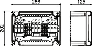 • 3 Schutzgeräte mit je 2 Push-In-Klemmstellen bis 6 mm² im Gehäuse vorinstalliert, bis 41 A DC pro Klemme