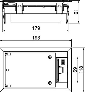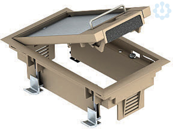 Geräteeinsatz für 2 Standard- (Bauform EKR) oder 3 Modul-45-Installationsgeräte in 1 Gerätebecher GB2 für den Einsatz in Doppelböden im Innenbereich. Befestigungswinkel mit einem Spannbereich bis 50 mm Plattendicke. Teppichschutzrahmen, Klappdeckel und Schnurauslass aus Polyamid.
