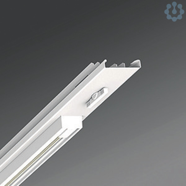 Geräteträger-Einsatz mit integrierter Universal-Dreiphasenstromschiene mit Dali (nutzbare Länge 680 mm) aus verzinktem, profiliertem Stahlblech zur Kombination von Akzent- und Allgemeinbeleuchtung, Oberfläche mit Polyesterharzlack beschichtet, mit zwei Drehverschlüssen für das schnelle Einsetzen in die Tragschiene. Wärmebeständige Leitungen einschließlich festpositioniertem 7-poligen Schnellmontage-Steckerteil mit werkzeugloser Phasenvorwahl und Suchfinger. Geeignet für Leuchten mit 3-Ph.-Stromsch.-Adapter (ET) von Regiolux, Global Trac, Eutrac, Iguzzini, Ivela, Powergear, Reggiani, Targetti, Zumtobel und 5-Ph.Stromsch.-Adapter (DALI) von Regiolux, Global Trac.