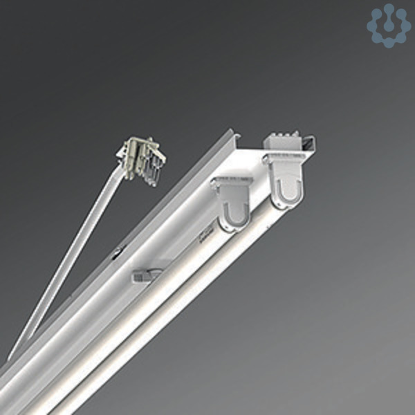 Geräteträger aus verzinktem, profiliertem Stahlblech, Oberfläche mit Polyesterharzlack beschichtet, mit zwei Drehverschlüssen für das schnelle Einsetzen in die Tragschiene. Geeignet für die Befestigung von Reflektoren und Spiegeln. Lichtverteilung direkt/indirekt freistrahlend. Zweilampige Ausführung mit versetzten Fassungen für reduzierte Leuchtdichtenunterschiede. Wärmebeständige Leitungen einschließlich Anschlussleitung 1m und 3-poligem Schnellmontage-Steckerteil mit werkzeugloser Phasenvorwahl und Suchfinger.