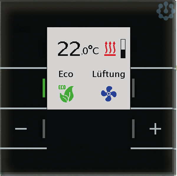 KNX Glas Raumtemperaturregler Smart mit Farbdisplay, Schwarz. Ausführung mit 4 Sensorflächen. Integrierter Busankoppler. Aktives Farbdisplay zur Funktions- und Statusanzeige. Hintergrundfarbe w/s und Displayhelligkeit einstellbar. Anzeige von Soll- und Isttemperatur. Raumtemperaturregler für Innenräume, Messbereich -10 bis +50 °C. Reglertyp (2-Punkt, PI, PWM) auswählbar. Einfache Sollwertverstellung über separate +/- Tasten. 1Bit +/-, 1Byte oder 2Byte Absolutobjekt zur Sollwertverstellung. Speicherung der Sollwerte bei Busspannungsausfall. Grenzwerte Min/Max, Frostalarm, Min/Max Wertespeicher. Umschaltung der Betriebsart über Bit/Byte Objekte. Lüftungssteuerung mit Hand- oder Automatikbetrieb. 14 Byte Objekt zur Klartextdiagnose. Empfohlene Montagehöhe: 1,6 m. Abmessungen (B x H): 92 mm x 92 mm. Integrierter Busankoppler.