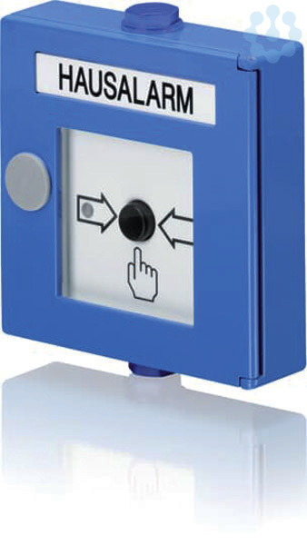 HM Handmelder der Grenzwerttechnik in Anlehnung an DIN EN 54 Teil 11 zur manuellen Alarmauslösung in Hausalarmanlagen. Für AP- und UP-Leitungseinführung, Gehäuse aus Aluminium-Druckguß, blau, für Innenmontage - Schutzart IP 42 (mit Regendach RD Schutzart IP 54 ), mit roter Alarm-LED und zusätzlichem potenzialfreiem Wechselkontakt (Schaltspannung max. 42 V DC)