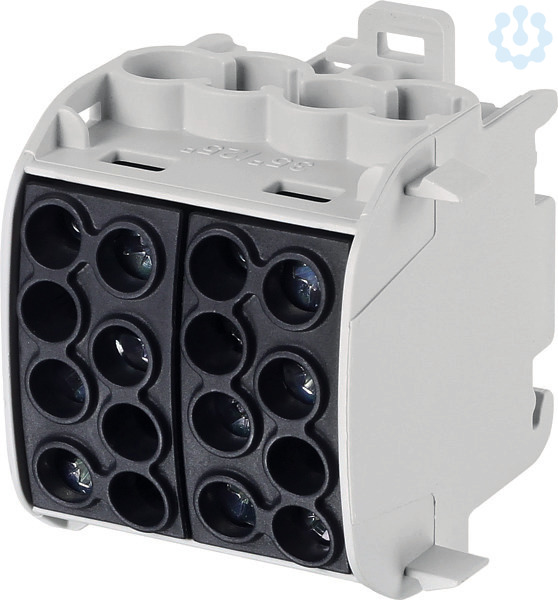 HLAK1p35Dsw; Hauptleitungsabzweigklemme, 1-polig, 35 mm²/Doppelblock ("L"); Zugang 4 x 35 mm², Abgang 4 x 25 mm²; Anschlüsse zertifiziert nach DIN VDE 0603-2; Mit Schnappbefestigung für waagerechte Montage