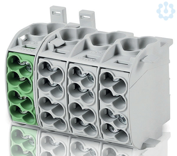 Hauptleitungsabzweigklemme 25mm² (Typ C). Farbe grau/grün. Montageart DIN-Schiene. Anzahl Pole: 4