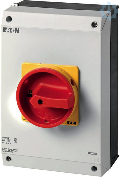 Hauptschalter, Sortiment: Hauptschalter, Wartungsschalter, Typkenner: P3, STOPP-Funktion: NOT-AUS-Funktion, mit rotem Drehgriff und gelbem Sperrkranz, Hinweis: UL/CSA, Information zum Lieferumfang: Hilfsschalterkontakt oder Neutralleiter nachrüstbar., 3-polig, Schutzart: IP65, Bauform: Aufbau, Bemessungsbetriebsleistung AC-23A, 50 - 60 Hz 400 V: P = 30 kW, Bemessungsdauerstrom: Iu = 63 A, Normen und Bestimmungen: IEC/EN 60947, VDE 0660, IEC/EN 60204, CSA, UL, Lasttrennschalter nach IEC/EN 60947-3