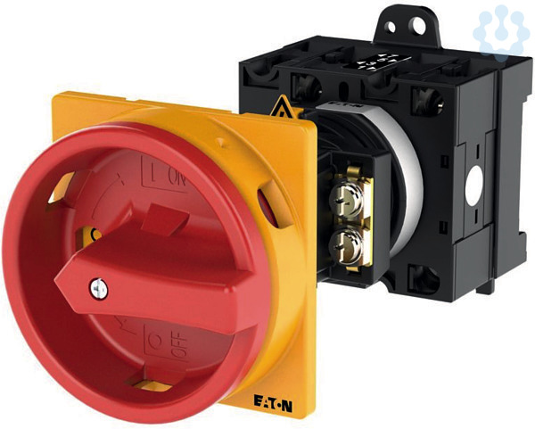 Hauptschalter, Sortiment: Hauptschalter, Wartungsschalter, Reparaturschalter, Typkenner: T3, STOPP-Funktion: NOT-AUS-Funktion, mit rotem Drehgriff und gelbem Sperrkranz, 3-polig, Schutzart: Front IP65, Bauform: Zwischenbau, Schaltwinkel: 90 °, Bemessungsbetriebsleistung AC-23A, 50 - 60 Hz 400 V: P = 15 kW, Bemessungsdauerstrom: Iu = 32 A, 2 Baueinheit(en), Normen und Bestimmungen: IEC/EN 60947, VDE 0660, IEC/EN 60204, CSA, UL, Lasttrennschalter nach IEC/EN 60947-3