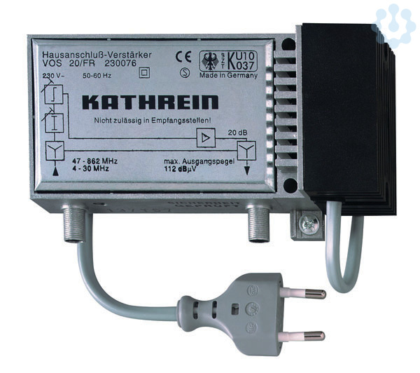 VOS 20/FR Hausanschluss-VerstärkerHausanschluss-Verstärker, 862 MHz, F-Connector,Verst.: 20 dB, Pegelst/Entz.: 20 dB, pass. Rückw.4-30 MHz, Max. Betriebsp. (60 dB CTB/CSO): 94 dBµVRauschmaß 5 dB,