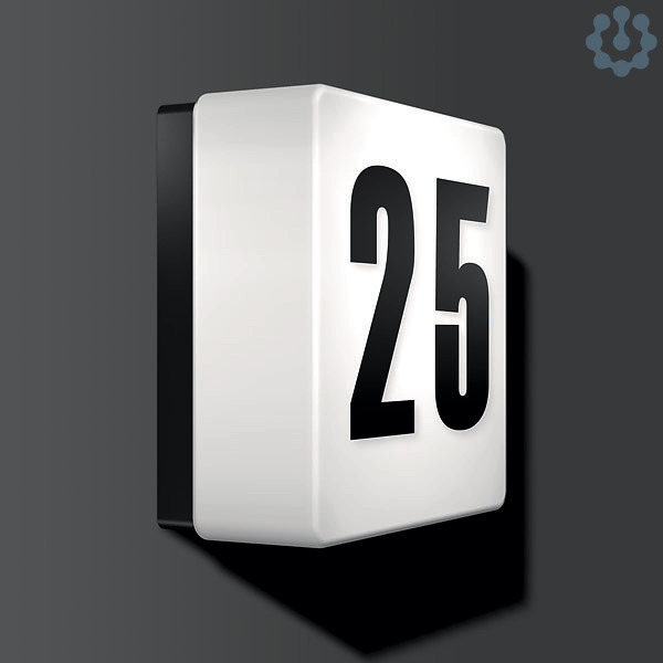 Quadratische Hausnummernleuchte. Armatur Kunststoff. Mundgeblasenes Opalglas seidenglanz. Glasbefestigung mit Federsystem. Mit integriertem Dämmerungsschalter. Beschriftung bitte separat bestellen!