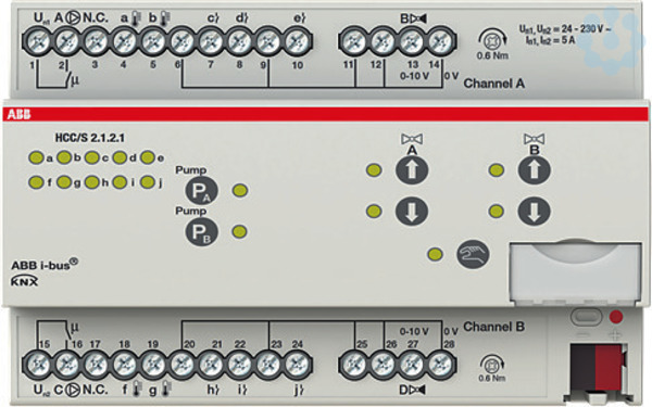 Für die Regelung eines Heiz- oder Kühlkreises. Das Gerät verfügt über 2 Kanäle, jeder mit einem analogen Ausgang zur Ansteuerung des 3-Wege Mischerventils (0…10 V) eines Heiz- oder Kühlkreises. Ebenso hat das Gerät einen Relaisausgang (5 A) zum Schalten der Zirkulationspumpe. Über 3 Binärsignaleingänge kann der Status der Pumpe überwacht (über potentialfreie Kontakte) und diese Rückmeldung in die Steuerung der Pumpe mit einbezogen werden. Die Vorlauf- und Rücklauftemperatur werden gemessen und für die Berechnung des Ventilstellwerts durch den integrierten Regler verwendet. Der Sollwert wird über den KNX Bus empfangen. Durch eine Kanalbündelung ist es möglich Systeme mit Doppelpumpen zu steuern.