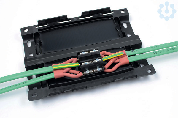 Heizband-X-Abzweig, Gelanschlusstechnik (Kaltanschlusstechnik), für die Verbindung von vier selbstlimitierenden Heizbändern, einschl. zwei Endabschlüsse, Betriebsspannung 230V, Schutzart IP68 (nicht für die Verlegung in der Dachrinne zugelassen), temperaturbeständig -25…+80°C (Anschlusstechnik), +60°C (Anschlussleitung)
