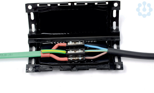 Heizbandanschluss- und Endabschlussgarnitur, Gelanschlusstechnik (Kaltanschlusstechnik), für selbstlimitierende Heizbänder, einschl. 2,00m Anschlussleitung, Betriebsspannung 230V, Schutzart IP66 (nicht für die Verlegung in der Dachrinne zugelassen), temperaturbeständig -25…+80°C (Anschlusstechnik), +60°C (Anschlussleitung)