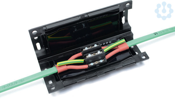 Heizbandverbindungsgarnitur, Gelanschlusstechnik (Kaltanschlusstechnik), für zwei selbstlimitierende Heizbänder, Betriebsspannung 230V, Schutzart IP68 (nicht für die Verlegung in der Dachrinne zugelassen), temperaturbeständig -25…+80°C (Anschlusstechnik), +60°C (Anschlussleitung)