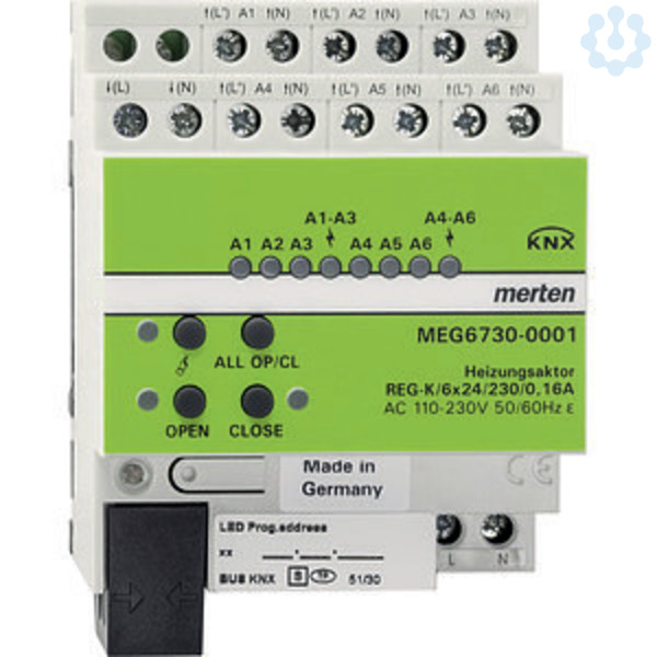 Zur Ansteuerung von elektrothermischen Stellantrieben für Heizungen oder Kühldecken. Der Heizungsaktor verfügt über 6 elektronische Ausgänge. Je Ausgang sind bis zu 4 Stellantriebe anschließbar. Die Ausgänge werden entweder schaltend (1 Bit) oder mit einem PWM-Signal (1 Byte) angesteuert. Mit Überlast- und Kurzschlussschutz für jeden Ausgang. Alle Ausgänge lassen sich mit Tasten manuell betätigen. Ein Baustellenbetrieb ist möglich. Für die Montage auf Hutschienen TH35 nach EN 60715. Der Busanschluss erfolgt über eine Busanschlussklemme. Softwarefunktionen KNX Charakteristik Stellantriebe (stromlos geöffnet/geschlossen), PWM Zykluszeit je Kanal, Ventilschutzfunktion je Kanal, Zyklische Überwachung der Stellgröße je Kanal, Betriebsstundenzähler. Statusrückmeldung je Kanal (Sollwert, Kurzschluss, Überlast, Ventilschutz aktiv, Servicemodus, Handbedienung aktiv, Zwangsführung aktiv), Sommer- und Winterbetrieb, Verriegelung jedes Ausgangs in eine Zwangsposition. Verhalten bei Busspannungsausfall und -wiederkehr, Netzausfallmeldung, Sammelrückmeldung, Senden der größten 1 Byte-Stellgröße. Nennspannung AC 110-230 V, 50/60 Hz. Ausgänge 6, elektronisch AC 24 V / 230 V. Nennstrom 0,05-0,16 A, ohmsch. Einschaltstrom max. 1,5 A (2 s). Mindestlast pro genutztem Ausgang 1 Stellantrieb. Anzahl Stellantriebe max. 4 pro Ausgang (230 V Antriebe). max. 2 pro Ausgang (24 V Antriebe). Gerätebreite 4 TE entspricht ca. 72 mm. Zubehör Thermoelektrischer Stellantrieb 230 V 639125. Thermoelektrischer Stellantrieb 24 V 639126. Lieferumfang Mit Busanschlussklemme und Leitungsabdeckung.