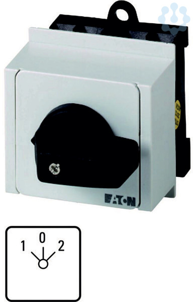Hilfsphasenschalter, Sortiment: Steuerschalter, Normen und Bestimmungen: IEC/EN 60947, VDE 0660, IEC/EN 60204, CSA, UL, Lasttrennschalter nach IEC/EN 60947-3, Typkenner: T0, mit schwarzem Knebel und Frontschild, Kontakte: 6, Schutzart: Front IP30, Bauform: Verteilereinbau, Schaltwinkel: 45 °, Schaltverhalten: tastend/rastend, mit 0-Stellung, mit 2-seitigem Rückzug, 3 Baueinheit(en), Bemessungsdauerstrom: Iu= 20 A, Frontschild: START>2-0-1<START