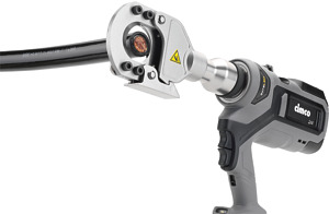 Schneidwerkzeug in Pistolenform: CimCut55: Schneidkopf 270°C drehbar, 2-Stufen-Hydraulik für High-Speed-Vorschub, manueller Rücklauf nach vollendetem Schnitt, auch zum Schneiden von Stahlstangen bis zu einem Durchmesser von 20 mm geeignet: Schneidkraft: 43kN; Zum Schneiden von: Feindrähtige Cu-Kabel bis zu einem Durchmesser bon 32 mm, Erdkabel Cu/AI bis zu einem Durchmesser von 51 mm, Telekom-Kabel bis zu einem Duchmesser von 55 mm, Cu massiv bis zu einem Durchmesser von 18 mm, AI massiv bis zu einem Durchmesser von 25 mm; Max. Schneiddurchmesser: 55 mm, Schneidzeit (querschnittsabhängig): 7-15s; Service-Zyklus: 20.000 Bestätigungen; Arbeitsbereich: -10°C bis + 60°C; Akkuspannung: 5.0 Ah-Li-Ion; Akkuladezeit: 40 Min.; Schneidkopf in Guillotine-Form, Maße: 500x335x75, Gewicht: 6600 g