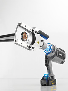 CimCut85 - Schneidwerkzeug in Pistolenform - Schneidkopf 360° drehbar, 2-Stufen-Hydraulik für High-Speed-Vorschub, manueller Rücklauf nach vollendetem Schnitt, auch zum Schneiden von Stahlstangen bis zu einem Durchmesser von 20 mm geeignet; Schneidkraft: 55kN; Zum Schneiden von: Cu/AI-Kabel bis zu einem Durchmesser von 85 mm; Max. Schneiddurchmesser: 85 mm; Schneidzeit (querschnittsabhängig): 8-20s; Service-Zyklus: 20.000 Bestätigungen; Arbeitsbereich: -10°C bis +60°C; Akkuspannung: 18 V; Akkukapazität: 5.0 Ah Li-Ion; Akkuladezeit: 60 Min.; Schneidkopf in Guillotine-Form; Größe: 580x340x86, Gewicht: 8800 g