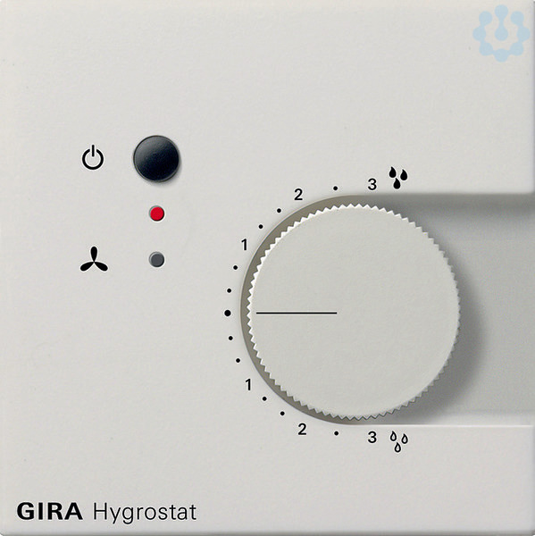 Elektronischer Hygrostat 230 V~Reinweiß glänzendMerkmale: Der Hygrostat erfasst über interne Sensoren den Feuchtegehalt sowie die Raumtemperatur und errechnet den optimalen Feuchtegehalt der Luft für die jeweils gemessene Temperatur. Übersteigt die Luftfeuchtigkeit den am Drehknopf eingestellten Wert, schaltet der Hygrostat z. B. einen Ventilator zur Entfeuchtung des Raums ein. Eine vom Installateur aktivierbare Festwertregelung verhindert (z. B. in öffentlichen Gebäuden), dass der Feuchtigkeitssollwert unbefugt verändert wird: In diesem Fall sind 60 % rF fest eingestellt, unabhängig von der Stellung des Drehknopfs an der Gerätefront. Um bei allgemein hoher Umgebungsluftfeuchtigkeit (z. B. bei Gewitterneigung) einen Dauerbetrieb des Ventilators auszuschließen, überwacht der Hygrostat die Einschaltzeit. Sinkt die Luftfeuchtigkeit nach einer Stunde nicht unter den eingestellten Wert, wird die Entlüftung für vier Stunden unterbrochen. Diese Unterbrechung wird durch eine Leuchtdiode angezeigt und kann mit einer Taste manuell beeinflusst werden.