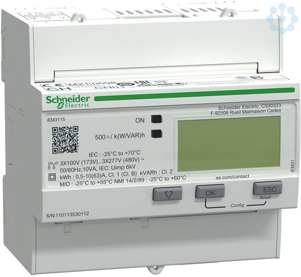 Acti 9 iEM3000 Baureihe. iEM3115 Energiezähler, 3-phasig, mit Teilzähler, 4 Tarife. Eingang_T 2, MID Ja, max. Bemessungsstrom 63 A. Drehstromzähler für Direktmessung bis 63 A. Anzeige vollgraphische LCD-Anzeige zur gleichzeitigen Klartextdarstellung von Menüpunkt/Messkategorie, Messwert, Einheit sowie aktivem Tarif. Teilzähler werden mit Zeitstempel (Datum&Uhrzeit) der letzten Rücksetzung angezeigt bzw. kommuniziert. Messfunktion Gesamt-Wirkenergiezähler ohne Resetfunktion und Teil-Wirkenergiezähler mit Resetfunktion. Weitere Bestelloptionen Verrechnungszählung MID konform gemäß EN 50470-3 (ehem. PTB-Zulassung), Wirkenergiezähler Gesamt und pro Phase. Schutzart Front IP 40, Gehäuse IP 20 (Hinweis zu MID Varianten für Konformität mit der Europäischen Messgeräterichtlinie MID 2004/22/EG muss das Messgerät in einem Schrank oder Gehäuse mit Schutzart IP51 oder besser verbaut sein).
