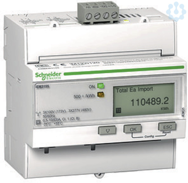 Acti 9 iEM3000 Baureihe. iEM3155 Energiezähler, 3-phasig, erweiterte Messfunktion, 1E/1A. Ausgang_K 1, COM Modbus, Eingang_K 1, MID Ja, max. Bemessungsstrom 63 A. Drehstromzähler für Direktmessung bis 63 A. Anzeige vollgraphische LCD-Anzeige zur gleichzeitigen Klartextdarstellung von Menüpunkt/Messkategorie, Messwert, Einheit sowie aktivem Tarif. Teilzähler werden mit Zeitstempel (Datum&Uhrzeit) der letzten Rücksetzung angezeigt bzw. kommuniziert. Messfunktion Gesamt-Wirkenergiezähler ohne Resetfunktion und Teil-Wirkenergiezähler mit Resetfunktion. Erweiterte Messfunktion für Energiezähler über Anzeige und Kommunikation Wirk-/Blindenergiezähler und Strom pro Phase, Wirkleistung, Leistungsfaktor gesamt, Spannungsmittelwert. Nur über Kommunikation Spannung, Wirkleistung pro Phase, Frequenz. Weitere Bestelloptionen Verrechnungszählung MID konform gemäß EN 50470-3 (ehem. PTB-Zulassung), Wirkenergiezähler Gesamt und pro Phase. Schutzart Front IP 40, Gehäuse IP 20 (Hinweis zu MID Varianten für Konformität mit der Europäischen Messgeräterichtlinie MID 2004/22/EG muss das Messgerät in einem Schrank oder Gehäuse mit Schutzart IP51 oder besser verbaut sein).
