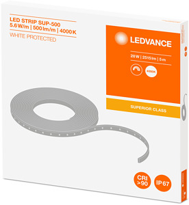 IP67 geschützte LED-Bänder mit 500 lm/m für professionelle Anwendungen mit sehr guter Farbwiedergabe und Lebensdauer. Produkteigenschaften: Flexibles und teilbares LED-Band. Kleinste teilbare Einheit: 50 mm. Lebensdauer (L80/B10): bis zu 60.000 h bei Tp: 45°C. Lichtstrom: 500 lm/m. Sehr gute Farbwiedergabeindex Ra: > 90. Anfängliche Farbkonsistenz: ≤ 3 SDCM (Schwellwerteinheit). Großes Spektrum an Farbtemperaturen: von Warmweiß bis kühles Tageslicht. IESNA LM79-, LM80 konform. Schutzart: IP67. Dimmbar mit geeigneten Treibern, siehe auch www.ledvance.de/dim). UV-Beständigkeit (nach IEC 60068-2-5). Salznebelbeständigkeit (nach IEC 60068-2-52). Produktvorteile: Große Designfreiheit dank langer, flexible LED-Lichtbänder. Einfache Installation, werkzeugloser Anschluss. Einfache Montage an vielen glatten Oberflächen durch selbstklebendes Klebeband. Geeignet für Verwendung in feuchten Umgebungen dank hoher Schutzart. Maximale Flexibilität dank großer Auswahl an Zubehör. Einfacher Anschluss durch beidseitig integrierte Kabel. Anwendungsgebiete: Allgemeine Innenbeleuchtung. Allgemeine Außenbeleuchtung. Industrie. Büros, Verkaufs- und Konferenzräume. Architekturbeleuchtung. Dekorative Beleuchtung. Technische Ausstattung: Verbindungen, Profile und Abdeckungen für verschiedene Montagemöglichkeiten verfügbar. Endkappen müssen separat bestellt werden.