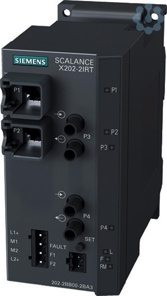 SCALANCE X202-2IRT managed IE IRT Switch, 2x 10/100 Mbit/s RJ45 Ports, 2x 100 Mbit/s Multimode BFOC, Fehlermeldekontakt mit Set- Taster, redundante Spannungs- Versorgung, PROFINET IO Device, Netzwerk-Management, Redundanz-Manager integriert, inkl. elektron. Handbuch auf CD-ROM, C-PLUG optional. SCALANCE X202-2IRT Managed, Layer 2 Kompakt Switch, 2x 10/100 Mbit/s RJ45, 2x 100 Mbit/s Multimode BFOC für taktsynchrone Motion Control-ApplikationenFür hoch performante, taktsynchrone Motion Control-Applikationen durch IRT mit integriertem Redundanzmanager.Schnelle Medienredundanz, optimale Performance durch Kombination der Switching-Mechanismen Cut Through und Store and Forward sowie hohe Netzwerkverfügbarkeit in Ringstrukturen und stoßfreie Redundanz bei Verwendung des PROFINET-konformen MRPD-Verfahrens. Sichere Datenkommunikation durch robusten, industriegerechten Geräteanschluss über PROFINET-konforme Steckverbinder mit zusätzlicher Zug- und Biegeentlastung. Wesentliche Vorteile beim Engineering, der Inbetriebnahme und der Betriebsphase einer Anlage durch integrierte Projektierung und Diagnose in STEP 7. Möglichkeit zum Gerätetausch ohne PG durch Einsatz des Wechselmediums C-PLUG. Zusätzliche Funktionen sind die PROFINET- Diagnose und Gerätediagnose über LED, SNMP-Zugang, integrierter Web-Server und automatische E-Mail-Sendefunktion für Remote-Diagnose und Signalisierung über das Netz.Managed, Layer 2 Kompakt Switch, DC 24 V, 2x 10/100 Mbit/s RJ45 Ports elektrisch, 2x 100 Mbit/s Multimode BFOC, PN IO mit IRT.Umfangreiches Zubehör wie z.B. das Wechselmedium C-PLUG, SITOP PSU100C 24 V/0,6 A zur geregelten Stromversorgung, IE SC RJ POF- und PCF Schraubstecker sowie deren dazugehörige Konfektionierkoffer zur Montage vor Ort, RJ45 Steckverbinder und verschiedene Leitungsvarianten rundet das System ab.Switch to the future - SCALANCE X.