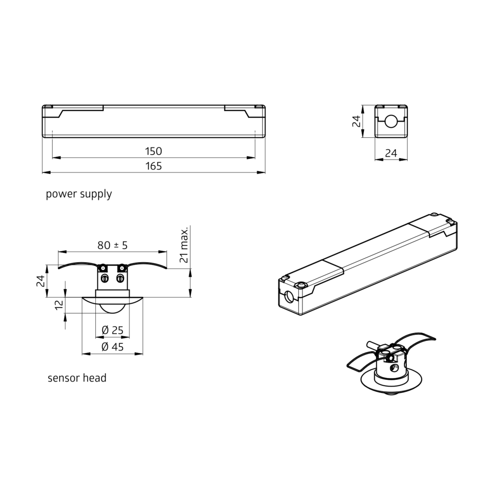 Mini-Bewegungsmelder mit einer Betriebsspannung von 12-48 V, Ein Kanal zum Schalten von Licht, Einfache Einstellung am Gerät, Leistungsteil passt durch die Bohrung für den Melder in der Decke (bei 34 mm d. ), Federklemmen für den einfachen und schnellen Einbau in abgehängte Decken und in Leuchten, Inklusive d. 45 mm Abdeckring und Abdecklamellen